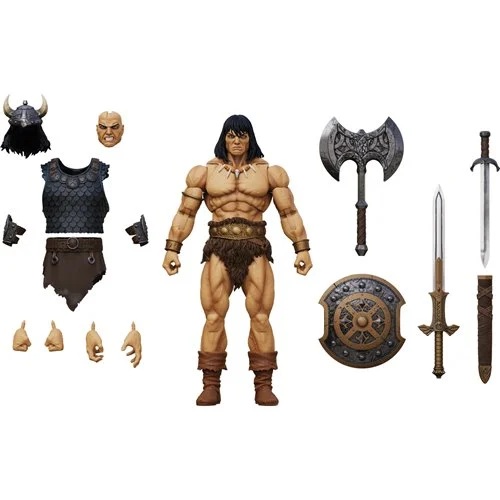 Conan includes 2x portraits, helmeted hair (interchangeable), hair (interchangeable), scale mail, double sided axe, zweihander, arming sword, sword sheath, studded shield, lion crested bracers, bronze bracers, fur lined armored belt, and 3x sets of hands. Pair him with theConan the Barbarian Belit Queen of the Black Coast Epic H.A.C.K.S. 1:12 Scale Action Figure (sold separately) for more mythical action!
