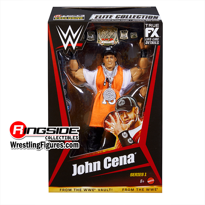 Rise up alongside the Chain Gang with John Cena! The WWE From the Vault line, exclusive to Ringside Collectibles, re-releases fan-demanded classic figures from the Mattel WWE line, and The Champ steps up with a confident, smiling headscan. Cena comes wearing black knee-length jorts and hi-top sneakers, as well as doubled-up black Chain Gang logo wristbands. He also comes with a white fabric t-shirt, orange fabric Cena #13 basketball jersey, dog tags, and an additional set of hands. His Chain Gang era look is represented with Chain Gang logo baseball cap and chain accessory, and The Champ wouldn’t be complete without title belts – Cena includes spinner belt versions of both the WWE World Heavyweight Championship and United States Championship!