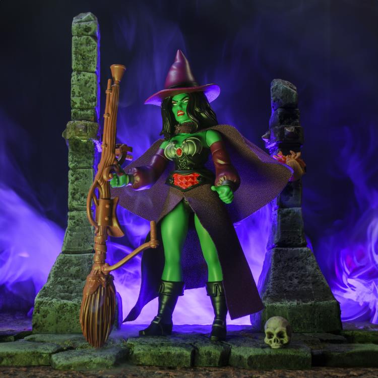 The Mischievous Mistress of Witchcraft flies on her battle broom hiding the demon inside her. Figure has a face changing feature and comes with gun broom, removable cape, skirt and belt.