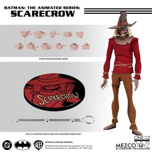The One:12 Collective Scarecrow faithfully captures the villain’s animated look with screen-accurate detail and a haunting presence. Featuring an extensive range of interchangeable portraits, face plates, hairstyles, and teeth, along with posable eyes on select heads, Scarecrow can be customized to create a wide spectrum of fear-inducing expressions—from subtle menace to full nightmare.