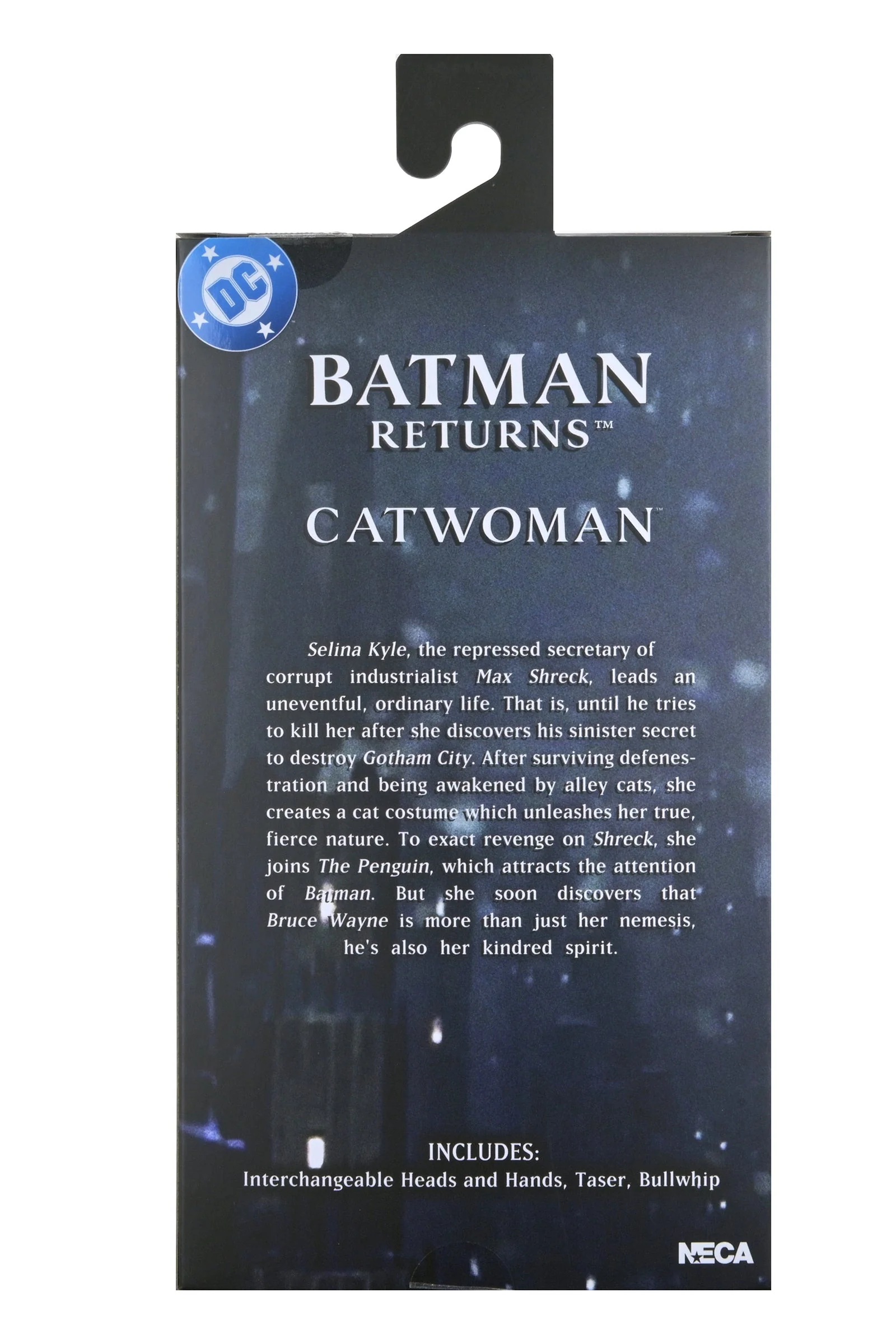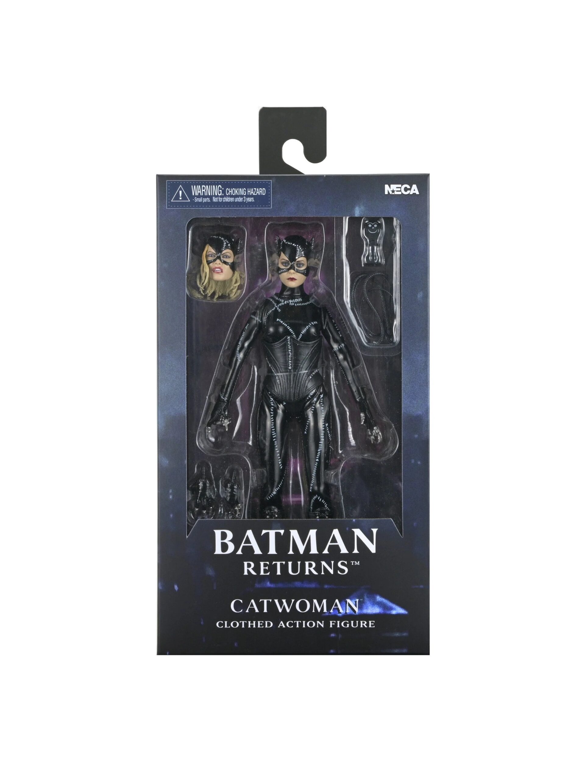 NECA presents this clothed action figure of Catwoman from Batman Returns, featuring the authorized likeness of Michelle Pfeiffer, whose unforgettable performance in the 1992 Tim Burton film still defines the character. Selina Kyle, the repressed and belittled secretary of corrupt industrialist Max Shreck, leads an uneventful, ordinary life. That is, until he tries to kill her after she discovers his sinister secret to siphon off power from the Gotham electrical grid, giving Shreck full control of energy for Gotham City. After surviving the fall and being awakened by alley cats, she unleashes her true, fierce nature and is re-birthed as Catwoman. She allies herself with The Penguin to exact revenge against Shreck and the Batman, who is trying to foil their criminal master plans.