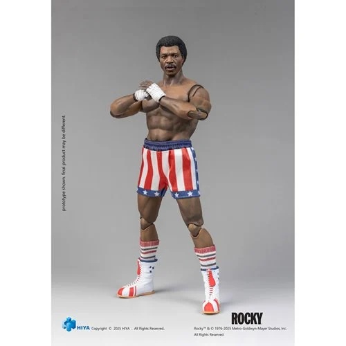 Previews Exclusive! Hiya Toys presents the Rocky I Apollo Creed Exquisite Super Series 1:12 Scale Action Figure – Previews Exclusive! Apollo Creed joins the fight! From Rocky (1976), the iconic heavyweight champion enters the series as a highly detailed 1:12 scale action figure. Standing approximately 6-inches tall, this figure captures Apollo’s powerful presence with a serious head sculpt, muscular build, and signature gear, including star-spangled boxing shorts, striped socks, and high-top sneakers. The set includes six interchangeable hands for dynamic poses, an alternate smirking head, a silver star vest, and a boxing ring base with a stool for full match scenes. Relive the intensity of the ring and Apollo’s legendary rivalry with Rocky Balboa with this must-have figure from Hiya Toys!