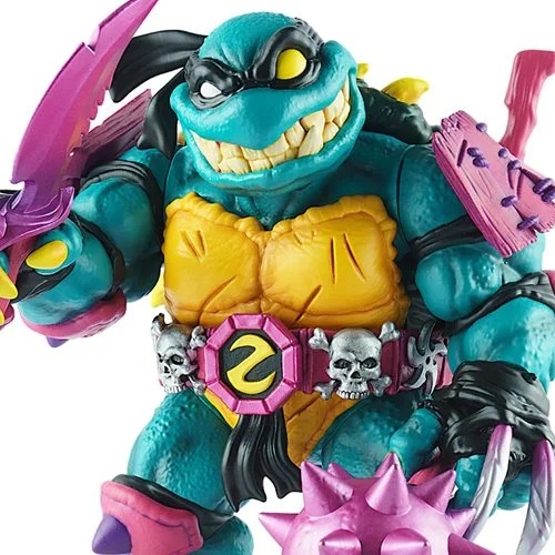 This snarling, spiked-out villain isn’t just talk — he comes locked and loaded with evil accessories, including the bone-busting Mutant Mace, the twisted Psycho Sai, the chain-swinging Nasty Nunchaku, and the Razor-Spiked Gnarly Knife! Each weapon can be wielded in battle or holstered for display, letting you pose this baddie in countless totally tubular ways.