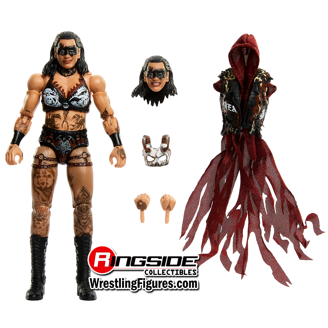 Unleash brutality with Rhea Ripley in Mattel WWE Ultimate Edition Series 30! The Nightmare is ready to terrify her opponents with high-level Ultimate Edition Articulation and two unique, dynamic headscans featuring black warpaint. Ripley delivers a Riptide to the competition wearing black-and-red gear with grim reaper illustrations and studded details, as well as black strap boots and fishnet stockings. Her accessories include an additional pair of interchangeable hands and full entrance gear including a biker vest with spiked shoulders and chain details and a horned skull mask!