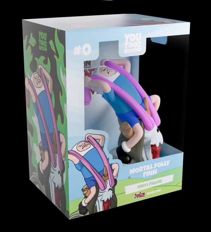Finn’s not messing around as he kicks some absolute butt with his Youtooz debut! Throwing his body back at 4.3 inches tall with a look of pure determination crossing his face that can only be obtained by liking someone a lot, he grips the sleeves of his bright pink sweater which he’s threaded through the Lich’s eye sockets as he wears his iconic blue shirt and shorts along with a white hat. While helplessly below Finn and letting out an agonising scream, the Lich’s grey face contorts from the pain of his defeat as brown horns stick out from either side of the pointed crown that sits atop his dark green hooded head. The exterior of his packaging sees the Lich firing a green flame directly at a sweater wearing Finn. While the interior is covered in a light blue and white sky which makes its way onto the protective sleeve above a rolling green field as his figure can be seen through the large clear window at the packaging’s front