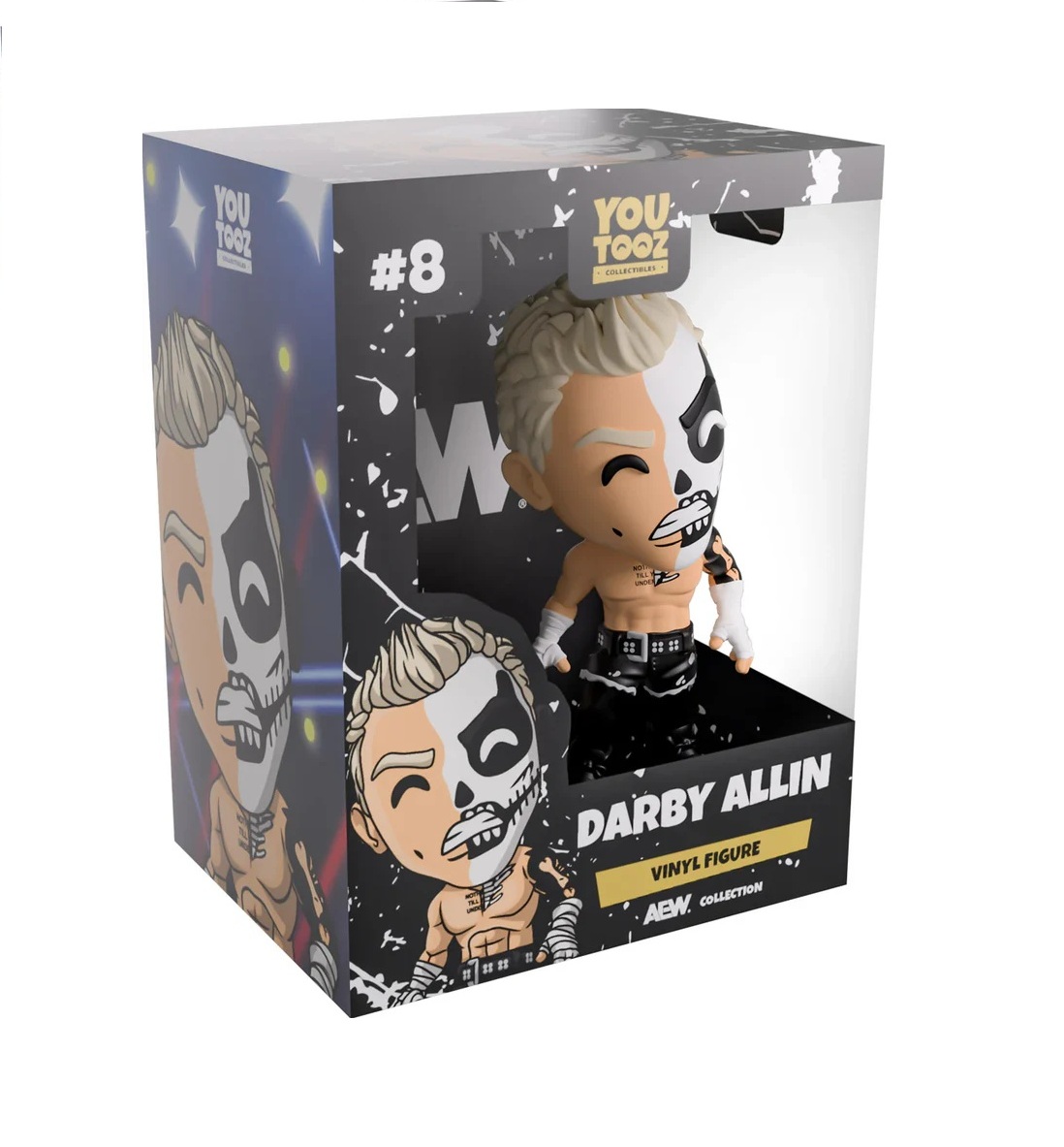 Darby Allin has challenged Youtooz to a coffin match with his debut! Honestly, we don’t have a chance, do we? Standing at 4.6 inches tall and leaning menacingly to the side as he’s ready to pounce into the fight, half of his grimacing face is covered in black and white to mimic an evil skull as short blonde hair is spiked up. With his muscular bare chest keeping the skeleton vibe going with bone markings, he wears wraps around his wrists along with shorts and a studded belt over black leggings and sneakers. The exterior of his packaging shows him standing atop a speaker with his arms outstretched. The interior is then covered in white cracks over a black background that spills onto the protective sleeve where his figure can be seen through the large clear window at the front of the packaging. This collectible was designed in collaboration with community member and ships in a matte, embossed, protective outer sleeve and a custom-sized plastic protector for maximum protection during shipping.