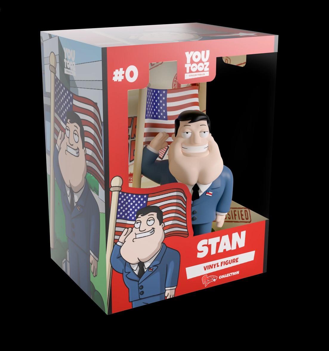 Stan Smith is on loan from the CIA to learn all about the people here at Youtooz with his debut! At 5.4 inches tall, this figure sees Stan with a huge smile crossing his chiseled face and saluting patriotically with a raised right arm as he wears his classic blue suit, white shirt and a black tie. Next to him lays a destroyed CIA sign surrounded by green foliage as an American Flag is hoisted up to blow in the wind majestically. The exterior of his packaging looks onto the entrance of the CIA building, while the interior of the box patterned with top-secret classified stamps, under the American Dad! logo. The protective sleeve is red with a star shooting across the bottom of the box as his figure can be seen through the large clear window at its front. This collectible ships in a matte, embossed, protective outer sleeve and a custom-sized plastic protector for maximum protection during shipping.