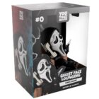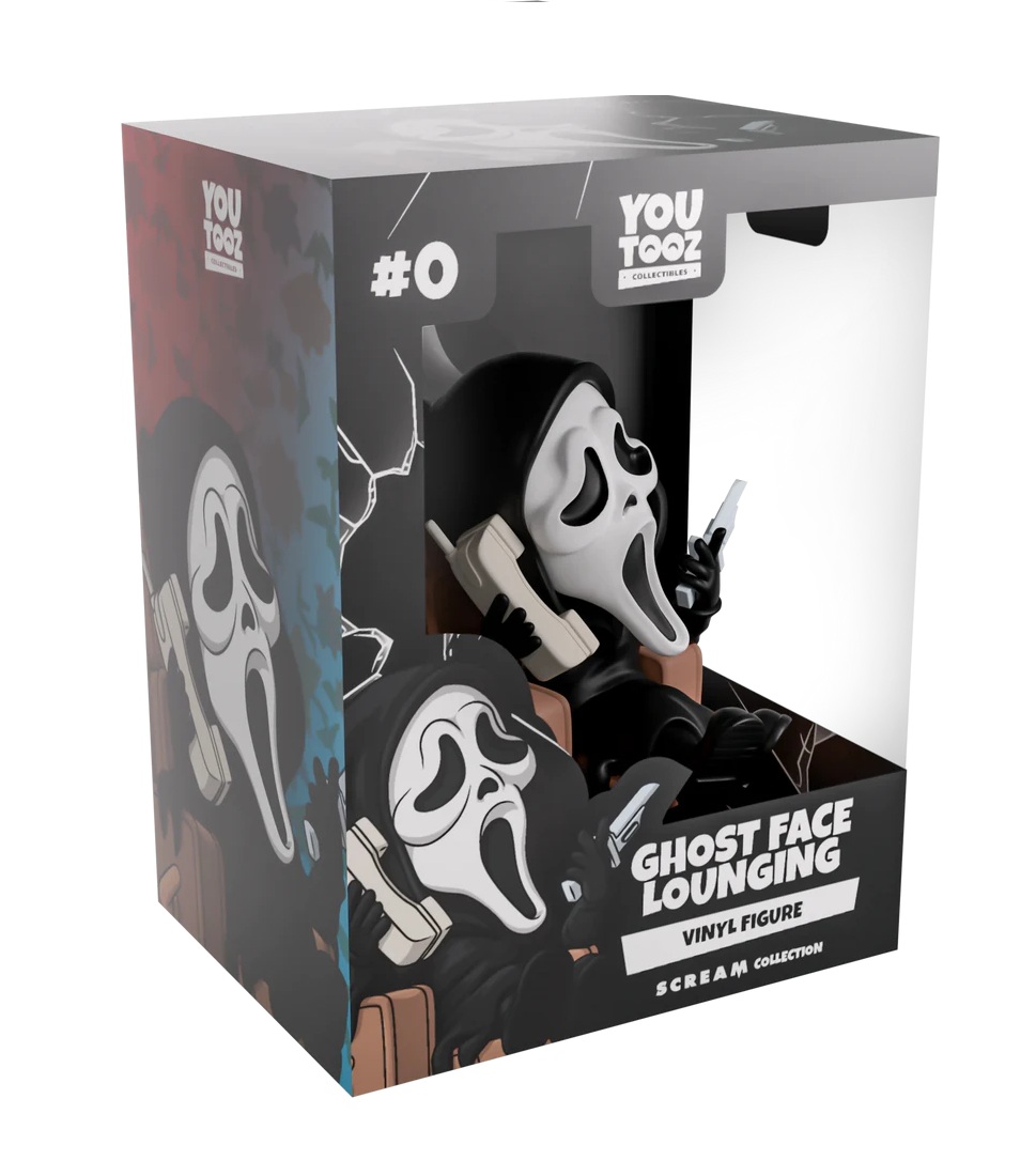Wait, who’s that on the phone? And why are they asking about returning to Youtooz?! Ghost Face is back to keep it chill as he kicks back on the comfiest brown recliner to sit at 4.1 inches tall with his feet hanging over the edge of the extended footrest and holding an old school phone up to his ear. Nonchalantly flicking a knife to the side and wearing his iconic white mask with slanted eyes and an elongated open mouth, his body is covered in a long black cloak that flows from his head down to booted feet. The exterior see’s Ghost Face leaning back and enjoying some snacks as he’s illuminated by a TV screen. While the pitch-black interior cracks with shattered glass as his white mask peers through the shadows, this then continues onto the protective sleeve where his figure can be seen through the large clear window at the packaging’s front. This collectible ships in a matte, embossed, protective outer sleeve and a custom-sized plastic protector for maximum protection during shipping.