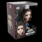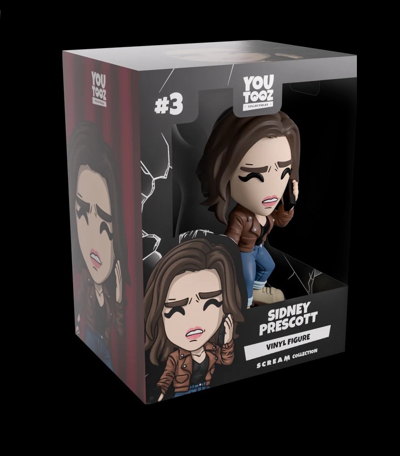 Watch out, Ghost Face! Sidney’s arrived at Youtooz in search of vengeance with her vinyl debut! Standing at 4.5 inches tall, with a look of concern flashing across her face as dark eyebrows furrow over a worried mouth, her long brown hair parts to the side and falls down to her shoulders in thick strands. Holding a phone to her ear with her left hand, as the right grips the handle of a black pistol, she’s dressed in a brown leather jacket over a v-neck black top, as the rolled cuffs of her tight blue jeans rest above pale boots. The exterior of her packaging looks into a dimly lit lounge room with bottles and glasses on a table in front of a brown couch. While the pitch-black interior cracks with shattered glass as Ghostface’s white mask peers through the shadows, this then continues onto the protective sleeve where her figure can be seen through the large clear window at the packaging’s front. This collectible ships in a matte, embossed, protective outer sleeve and a custom-sized plastic protector for maximum protection during shipping.