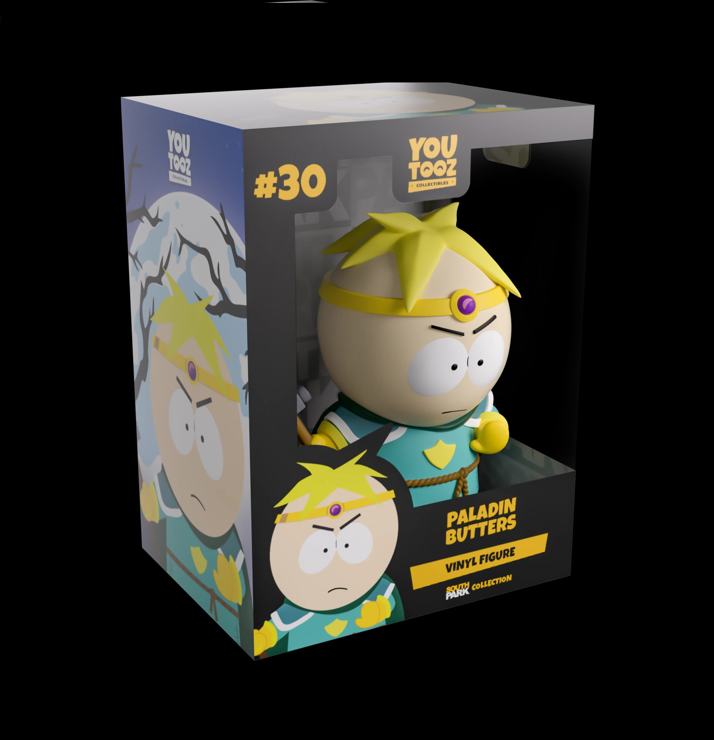 Butter is here to make his righteous return to Youtooz! Standing at 3.5 inches tall with his hand raised to the front to stop you in your path as the left grips a solid hammer, a stern look crosses his face underneath a golden circlet and a mess of yellow hair. With a long green cloak hanging from his shoulders, he’s dressed in a teal top with a yellow symbol on the chest and a brown rope wrapping around his waist. The exterior of his packaging sees a full moon gleaming through bare tree branches. The interior is then a simple greyscale repeating pattern of the South Park Logo, while the protective sleeve sees the four boys’ faces peeking from the corners over a rich black background, as his figure can be seen through the large clear window at the packaging’s front. This collectible ships in a matte, embossed, protective outer sleeve and a custom-sized plastic protector for maximum protection during shipping.